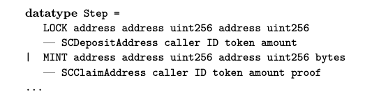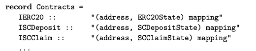 As with many formal method specifications, we view the system as a transition system. We first specify the state of the contracts. For instance, we could define a record type for the state of SCdeposit and collate all the contracts as a mapping of address to contract state.