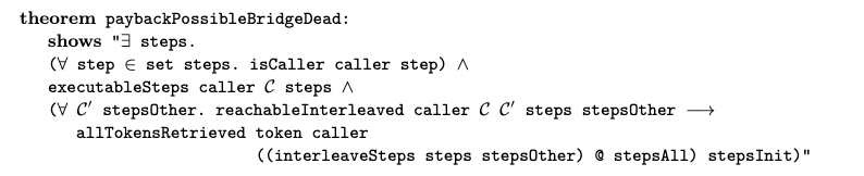 Isabelle’s definition of the bridge’s formal model comprises around 900 lines of code (LOC), including approximately 50 defined functions, while the accompanying proofs span roughly 15,000 LOC. The current proof contains approximately 750 lemmas and theorems.