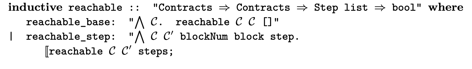 Reachability between blockchain states is defined inductively. Each state is reachable from itself. If C′ is reachable from C by a series of steps, and executing a step reaches C′′ from C′, then C′′ is reachable from C by the combined series of steps.