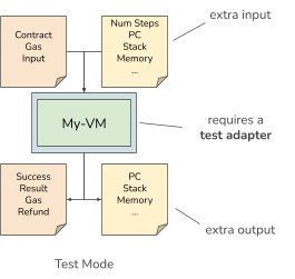 To use the test generator and the specification for checking the conformance of SonicVM, we extend the virtual machine with a test adapter. The test adapter permits the injection of a new state, can perform a single transition (or multiple transitions), and permits reading the result state after the test. Hence, this test mode provides extended functionality beyond running the virtual machine for executing a single smart contract.