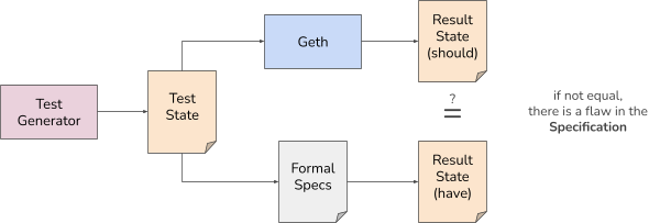 The test generator produces a test state. Geth’s EVM is primed with the test state, and a single state transition is executed using the new test interface in Geth. The Result state of Geth is cross-checked with the result state of the formal specification for the given test state.