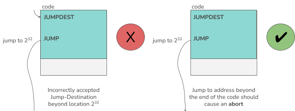 For example, in an early version of the SonicVM, the address range of a JUMP instruction was not checked correctly. In case that the arithmetic computation for the JUMP destination overflowed, the first instruction was executed assuming it was a JUMPDEST. Though in a normal setup, it still failed because we did not have JUMPDEST as a first instruction in the EVM bytecode. Hence, we could not identify the issue. However, the testcase generator identified the issue by generating as a first instruction a JUMPDEST instruction that showed that the implementation was wrong.