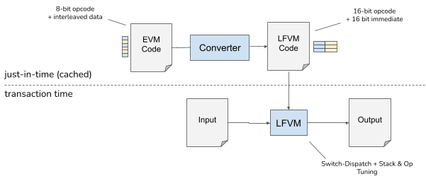The converter converts the EVM bytecode to the LFVM code. The converter is only invoked if the smart contract cannot be found in the code cache. At transaction time, when the smart contract is executed, the long-format representation of the smart contract is used to execute it.